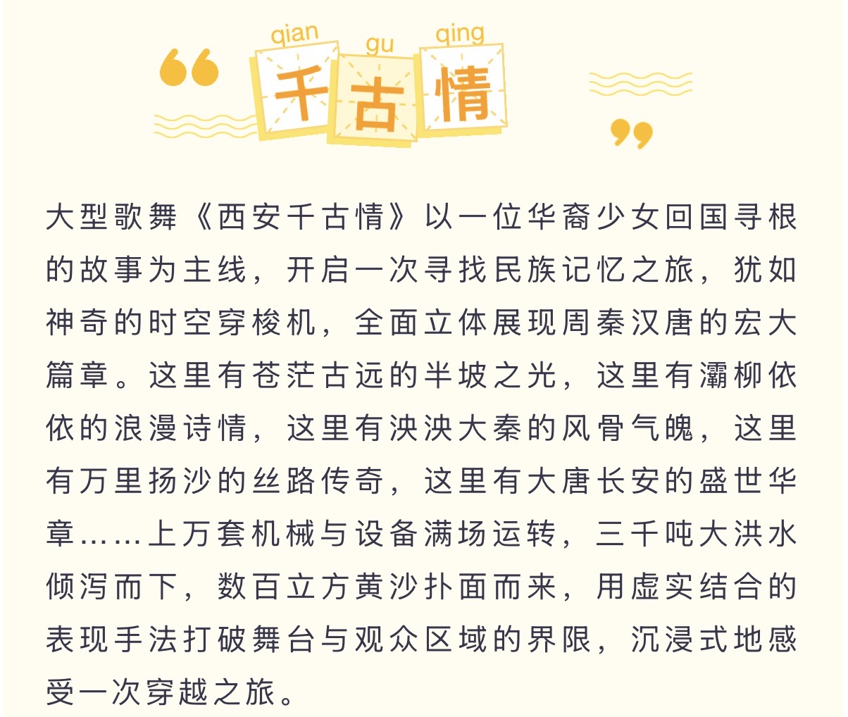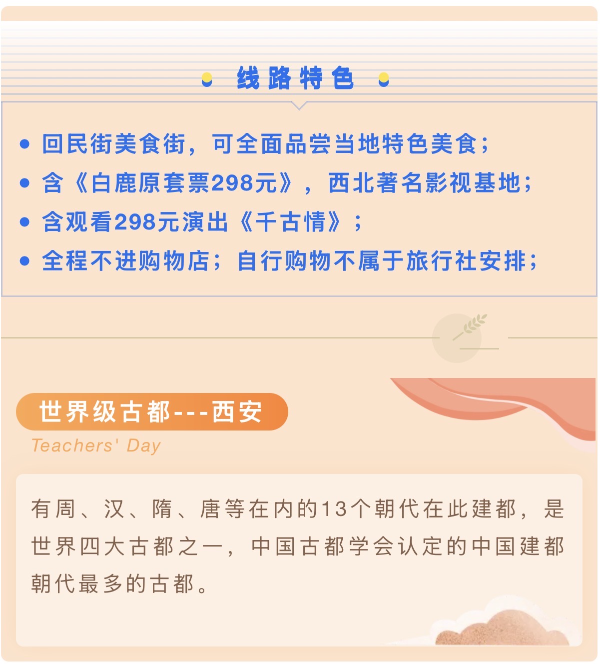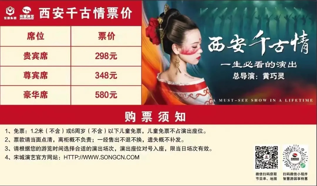 2、含298元白鹿原套票,含觀看298元演出《千古情》,不含景區內自愿體驗項目。含兵馬俑門票120元/人(65周歲以上老人及16周歲以下學生免票,因景區降噪,禁用擴音器,建議租用無線耳麥30元/人)