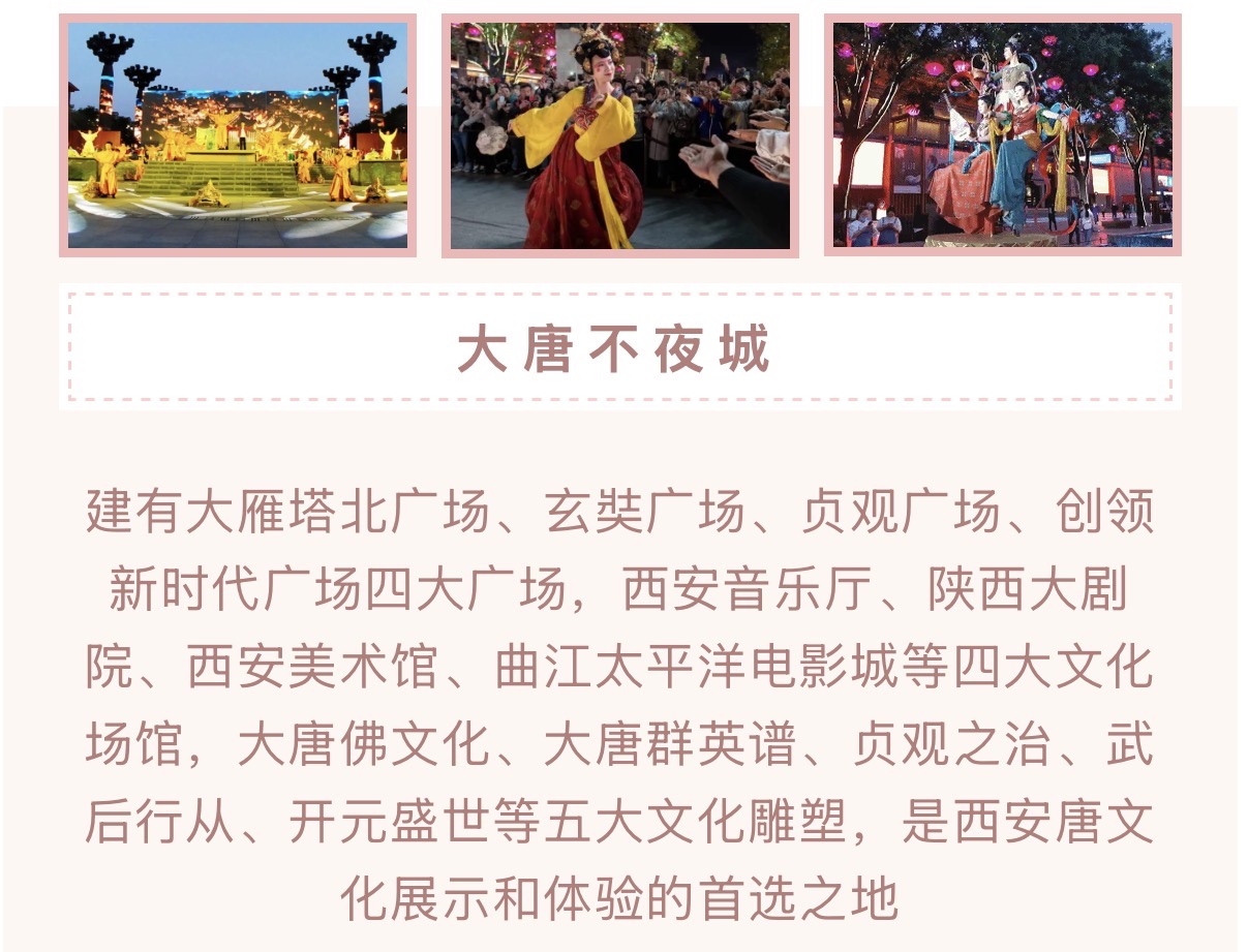 早上指定時間地點集合乘空調旅游車赴西安,這座十三朝古都,給予了這座城市不朽的靈魂:秦嶺之下,渭河之濱。千年古都西安現在依然沐浴在每日的晨鐘幕鼓中。只有親臨西安,你才能真正領悟“給你一天,還你千年”的涵義。抵達后參觀西安標志性建筑—【鐘鼓樓廣場】,西安鐘鼓樓廣場面積達6萬平方米,僅次于北京的天安門廣場。鐘、鼓樓遙相輝映故有“姊妹樓”和“文武樓”之稱。詩云“朝鐘幕鼓不到耳,明月孤云長掛情”即是對兩樓的精恰寫照。夜色中的鼓樓廣場流光溢彩,是西安的地標性建筑,城市的會客廳。【回民風情美食一條街】自由活動,西安回民街是西安著名的美食文化街區,賈平凹先生筆下的西安美食集中于此,是西安特色小吃最集中的街區,也是來西安必去的地方。走累了,餓了吧,別急,美食來了--賈三灌湯包,牛羊肉泡饃,麻醬涼皮。一定會讓吃貨們食欲大動,展開一次小吃的又一次饕餮盛宴。參觀【大雁塔南北廣場】,大雁塔廣場就位于舉世文明的佛教圣地大雁塔腳下,唐代高憎玄奘曾在此譯經。北廣場是目前亞洲最大的噴泉廣場。南廣場建于大慈恩寺前,標志性建筑為玄奘立式雕像,外觀大雁塔,與玄奘法師銅像自由合影留念。游覽【大唐不夜城】觀看各種免費演出,還可以偶遇抖音網紅不倒翁小姐姐親密接觸,甜美的笑容和婀娜的身姿必然讓您身心愉悅。大唐不夜城的中軸景觀大道是一條1500米橫貫南北的中央雕塑景觀步行街,其上分布著盛世帝王、歷史人物、英雄故事、經典藝術作品等九組主題群雕,立體展現大唐帝國在宗教、文學、藝術、科技等領域的至尊地位并彰顯大國氣象。核心展示區大唐不夜城,以如夢如幻的燈光,絢爛無比的夜景,開啟西安夜空中的最絢爛的暮景,感受大唐盛世不夜天的璀璨歷史。