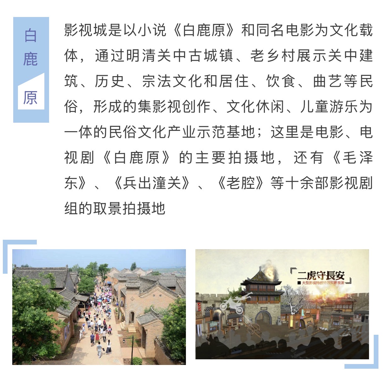 早餐后游覽西北著名影視基地——【白鹿原影視城】(含首道門票,及價值298元白鹿原二消:上行交通+《華陰老腔》演出+《二虎守長安》演出+關中大地震、長安翱翔、公元一萬年、穿越大峽谷(四選一)+參觀鹿子霖家、白嘉軒家+聲音博物館+下行觀光車