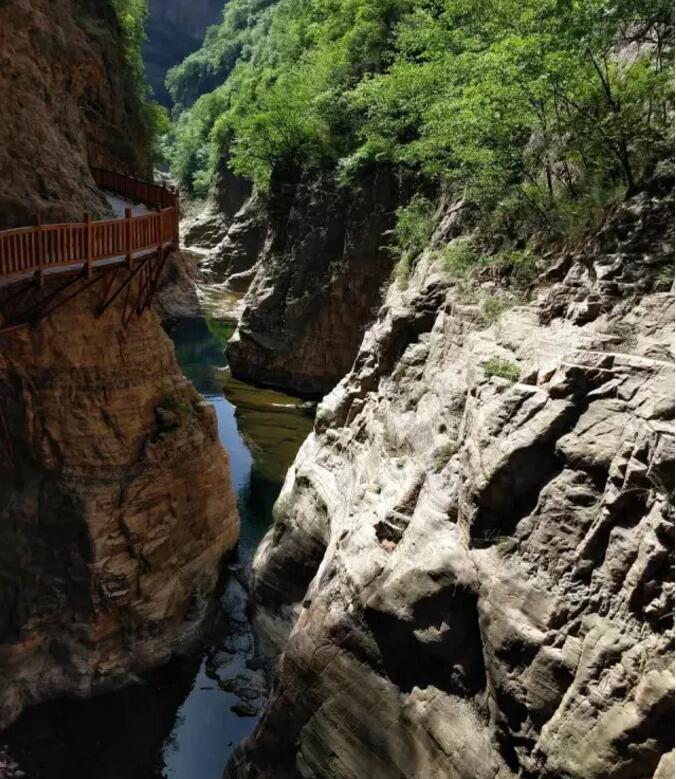 【雙龍峽】傳說因黃帝的兩條御龍棲居在這里而得名。峽谷主體,,長約5公里,其寬處約二三十米,窄處僅一二米。由紫紅色的石砂巖構成,峭壁嶙峋,潭瀑錯落,表現為典型的紅巖嶂谷地貌特征。