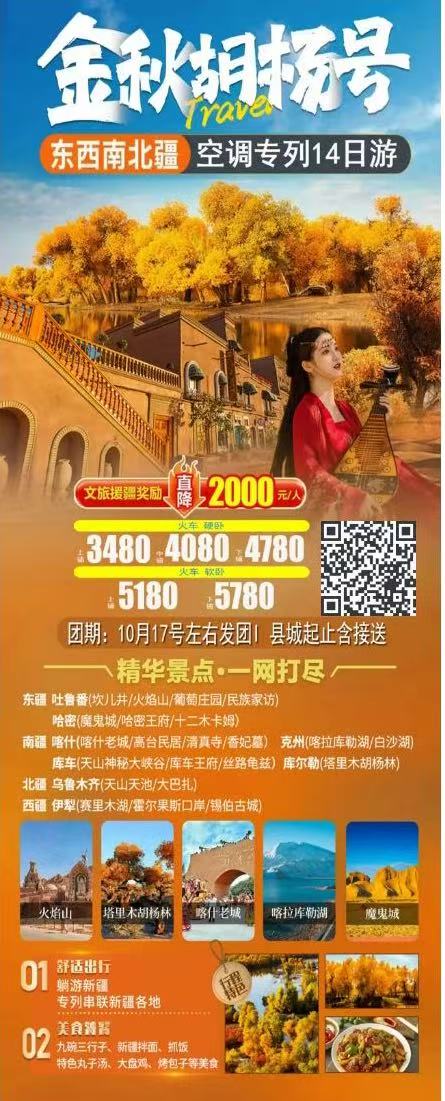 新疆--【金秋胡楊號】東西南北疆空調專列14日游