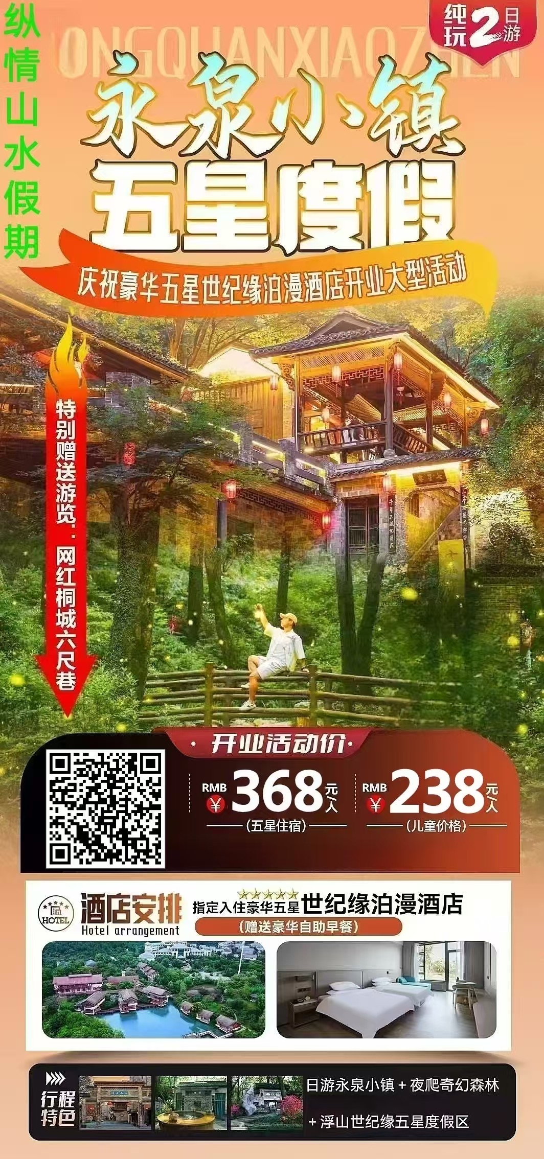 安徽--【五星純玩】特價(jià)368元!永泉小鎮(zhèn)+浮山純玩2日游