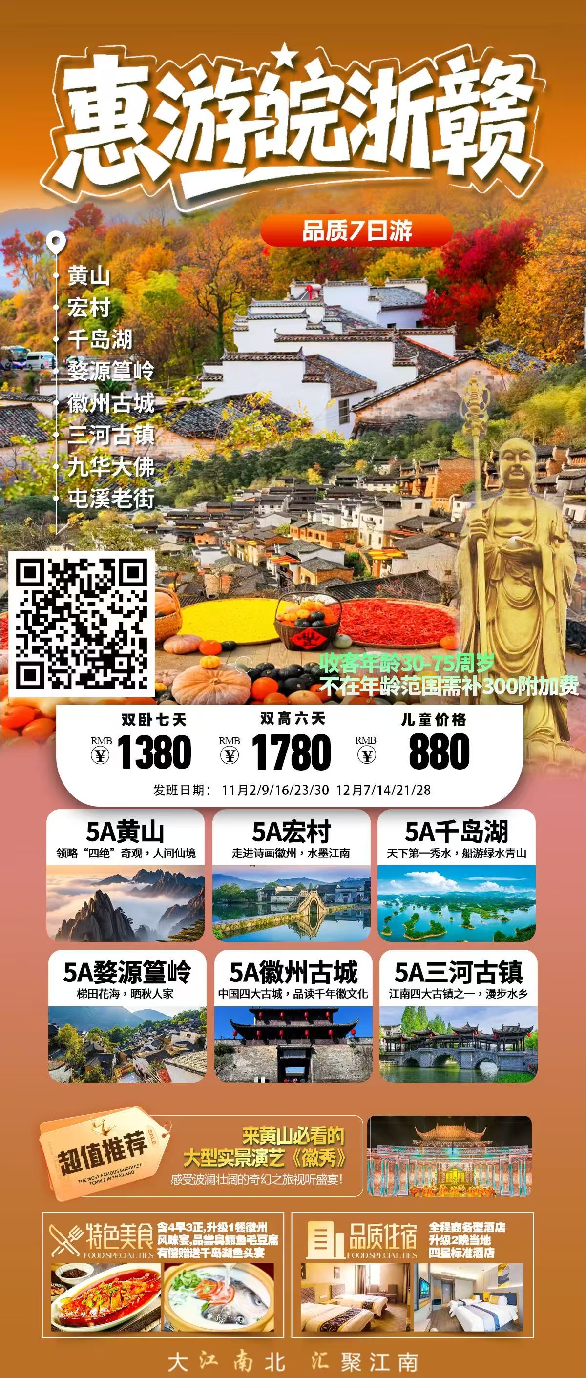 安徽--【惠游皖浙贛】黃山、宏村,婺源篁嶺、徽州古城雙臥七日游:高鐵六日游