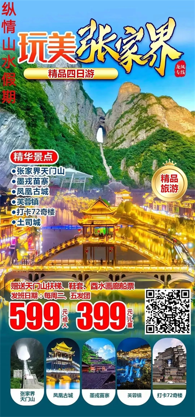 湖南--特價599丨天門山扶梯、鞋套、酉水畫廊船票丨張家界天門山國家森林公園丨芙蓉鎮丨土司王府丨墨戎苗寨丨鳳凰古城丨四日游